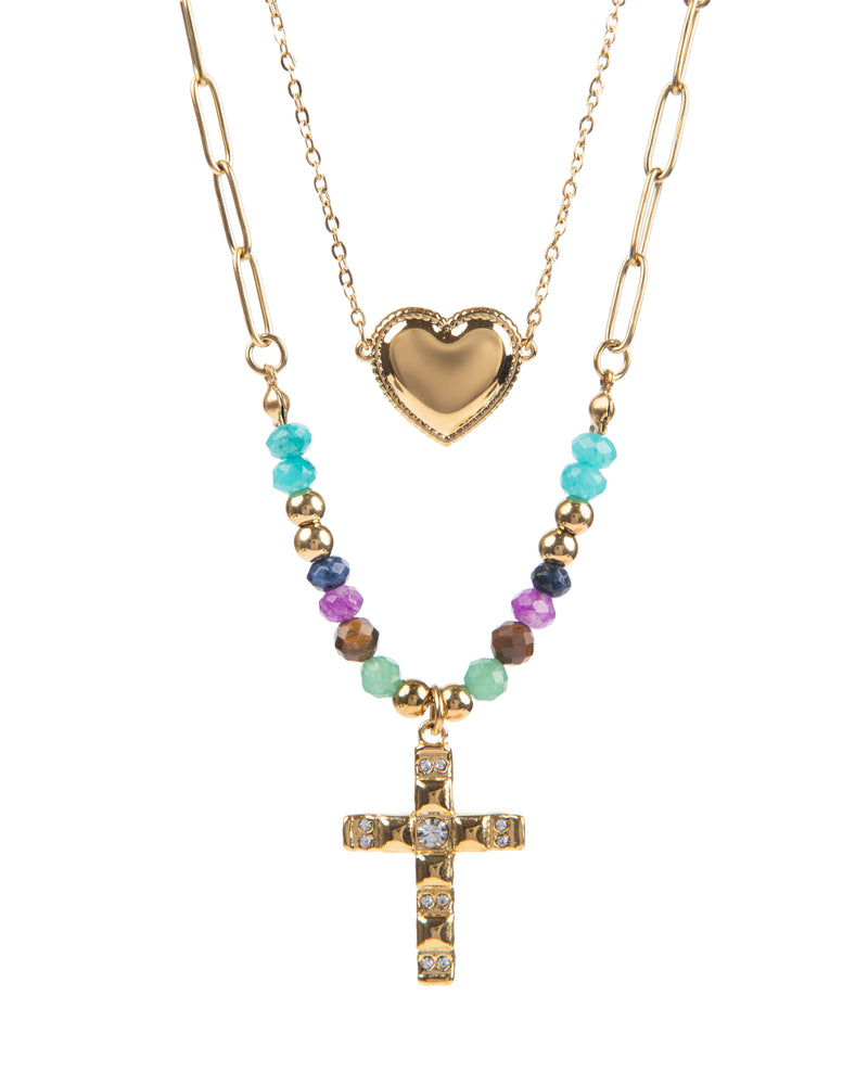 EDELSTAHL KETTENSET 18K VERGOLDET KREUZ UND HERZ
