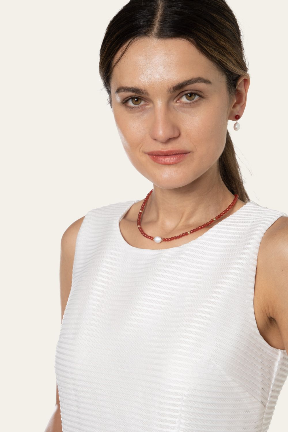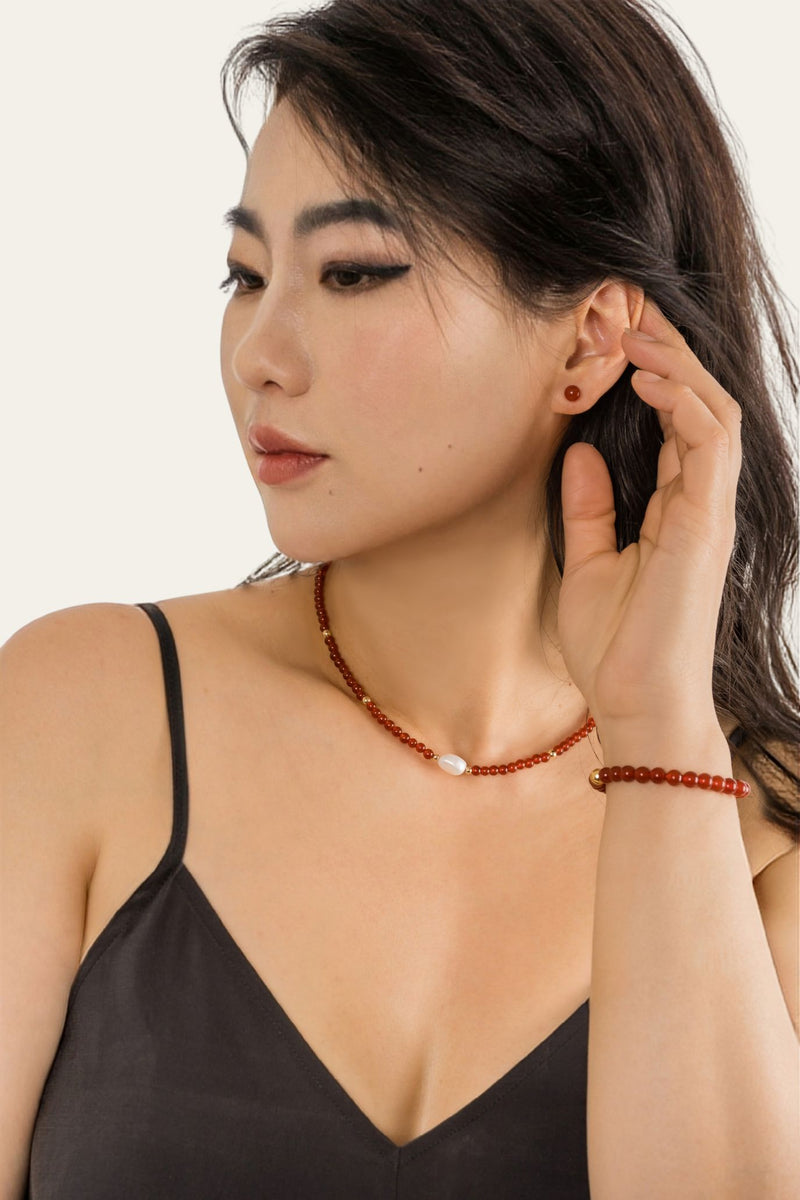 - Matériaux : Perles de culture et pierres précieuses telles que la cornaline et le jade chinois, chaque perle étant sélectionnée à la main