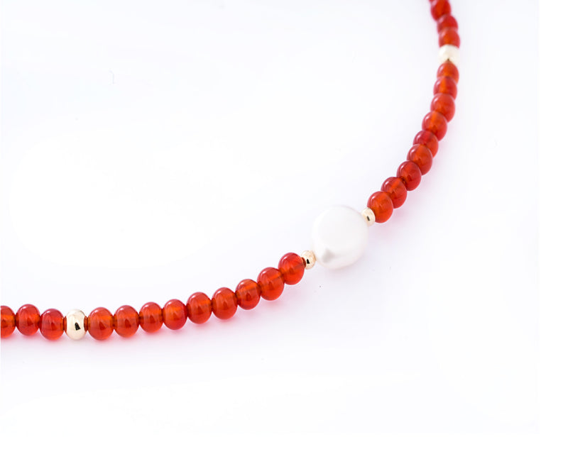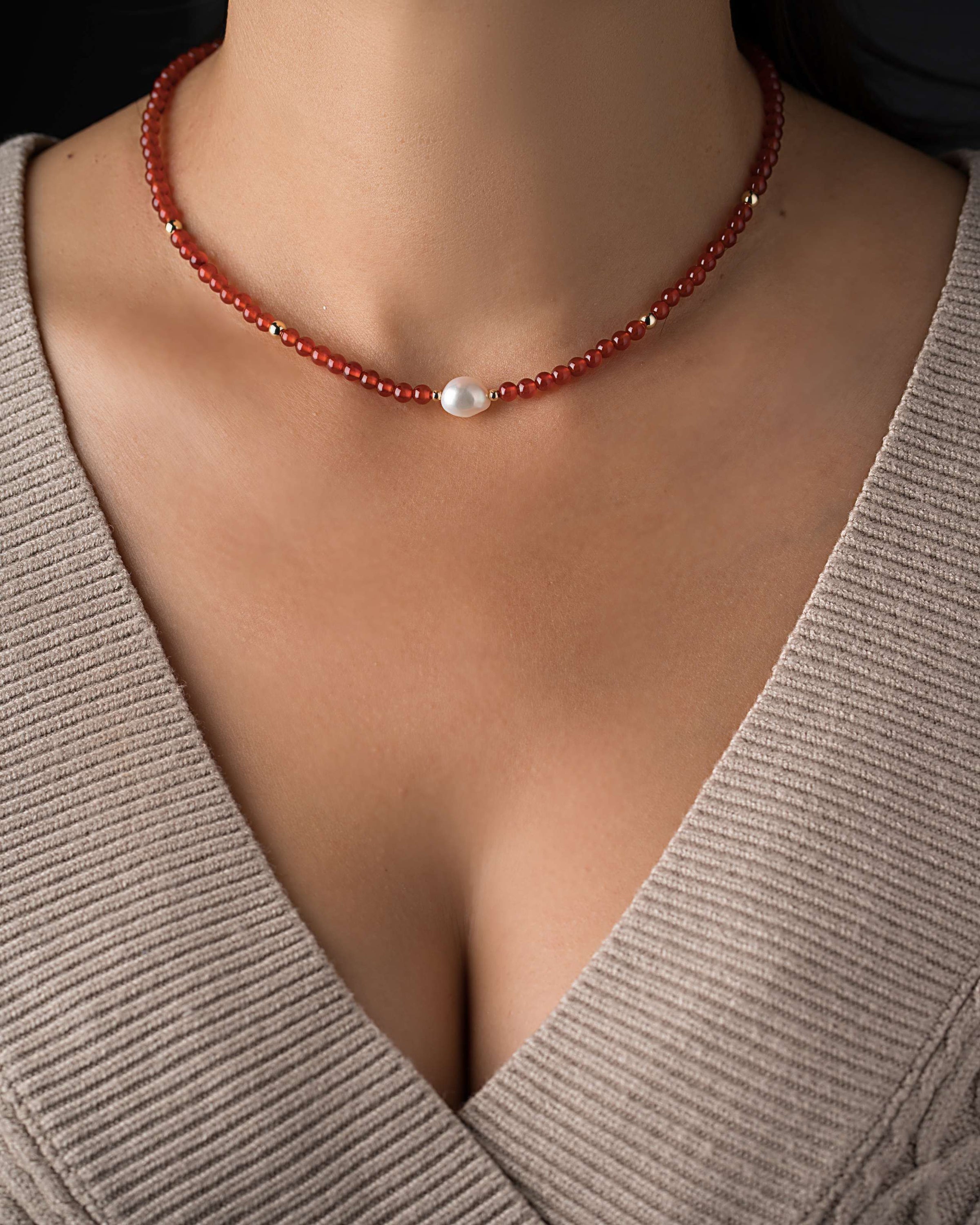 Ce magnifique collier est composé de perles de pierre de cornaline rouge et d'une seule perle baroque. Les petites perles remplies d'or 14 carats ajoutent une touche de luxe. La longueur de la chaîne peut varier de manière flexible entre 42 et 45 cm. L'élégante chaîne à fermoir est également remplie d'or 14 carats. On dit que la cornaline a des effets fortifiants et cicatrisants depuis des milliers d’années. Une seule perle baroque de haute qualité constitue le point culminant du collier. Les perles naturelles incarnent la féminité et la pureté gracieuses dans presque toutes les cultures. Ils ont un effet à la fois calmant et clarifiant. Nous appelons ce collier « Audrey » car il met en valeur la grâce, la féminité et la beauté de celle qui le porte et lui confère également un charisme élégant avec une apparence de star. Soyez la star de votre propre vie !